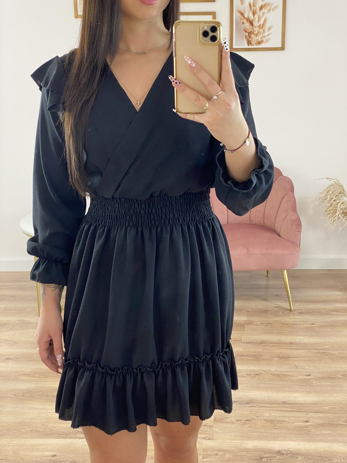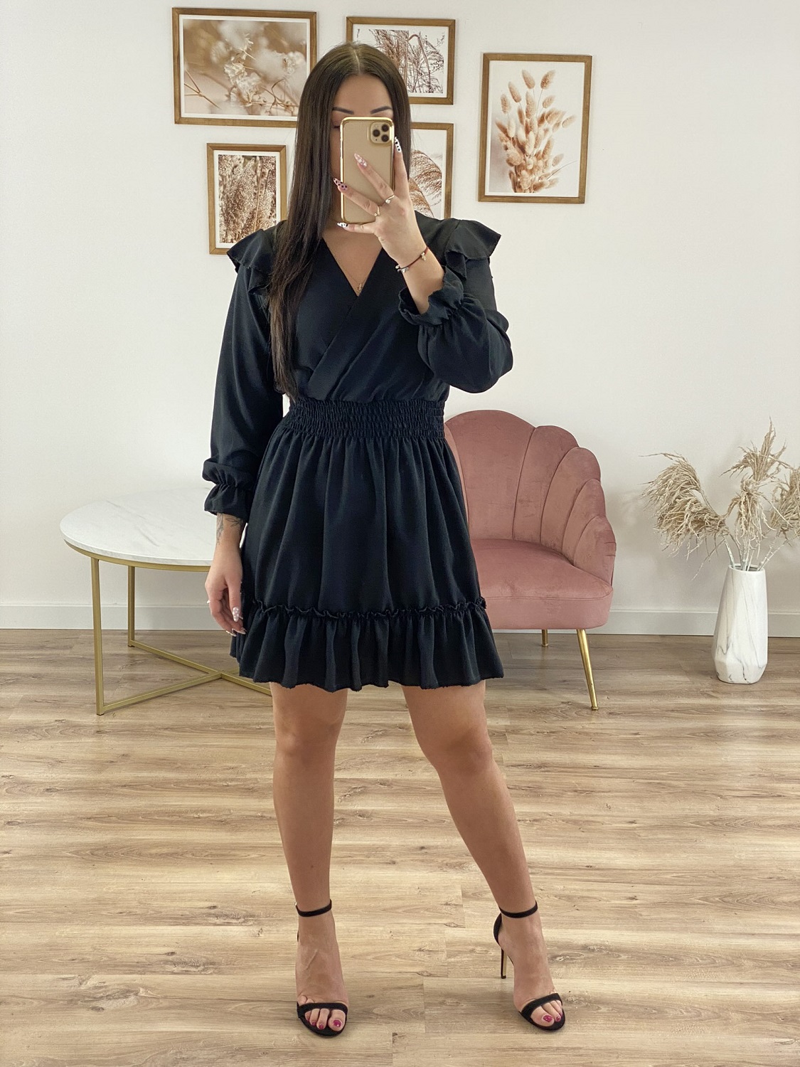 Mini sukienka z ozdobną falbanką u dołu i przy ramionach. Posiada kopertowy dekolt, długi rękaw wykończony ozdobną gumką i gumkę w pasie.