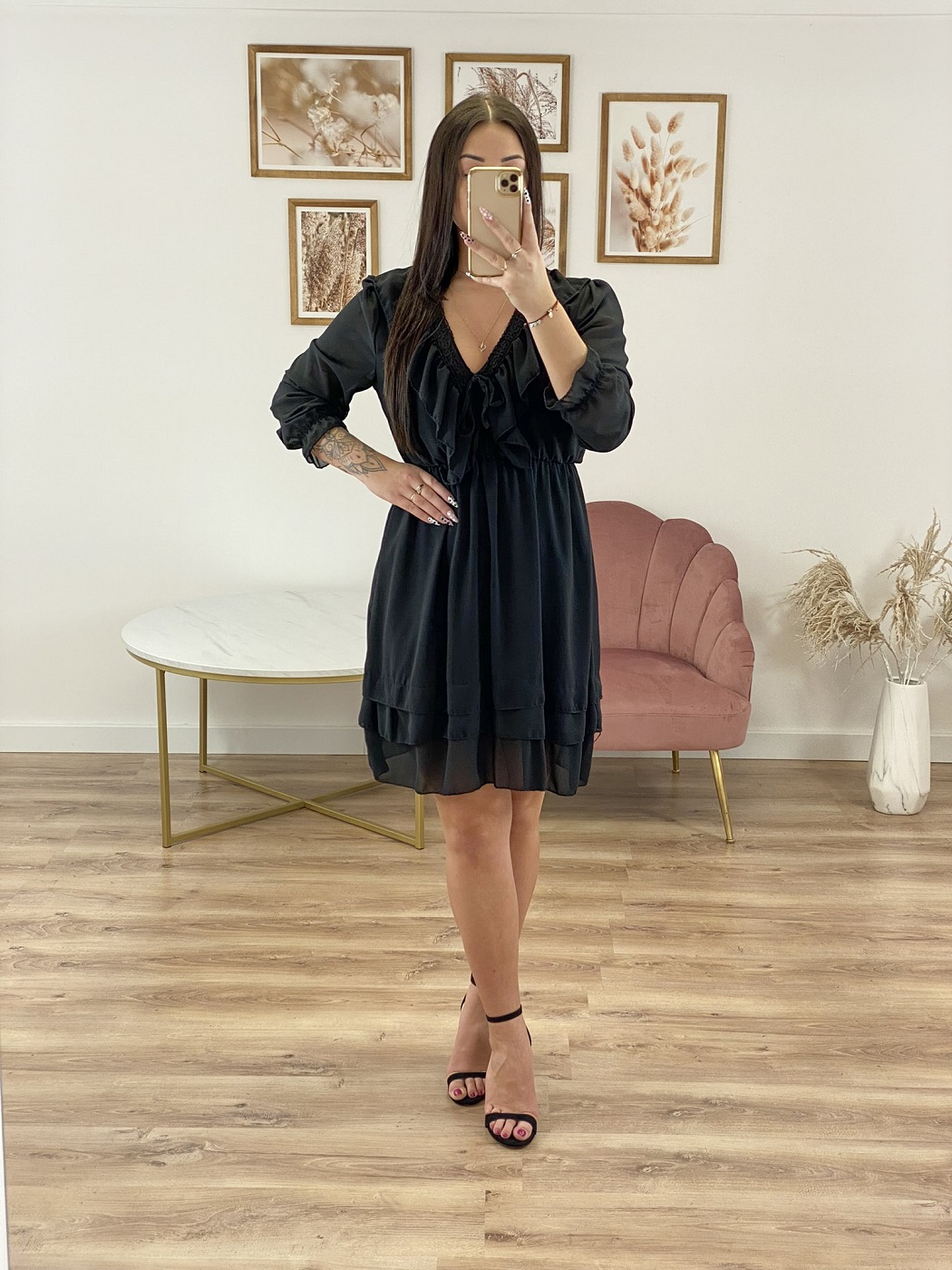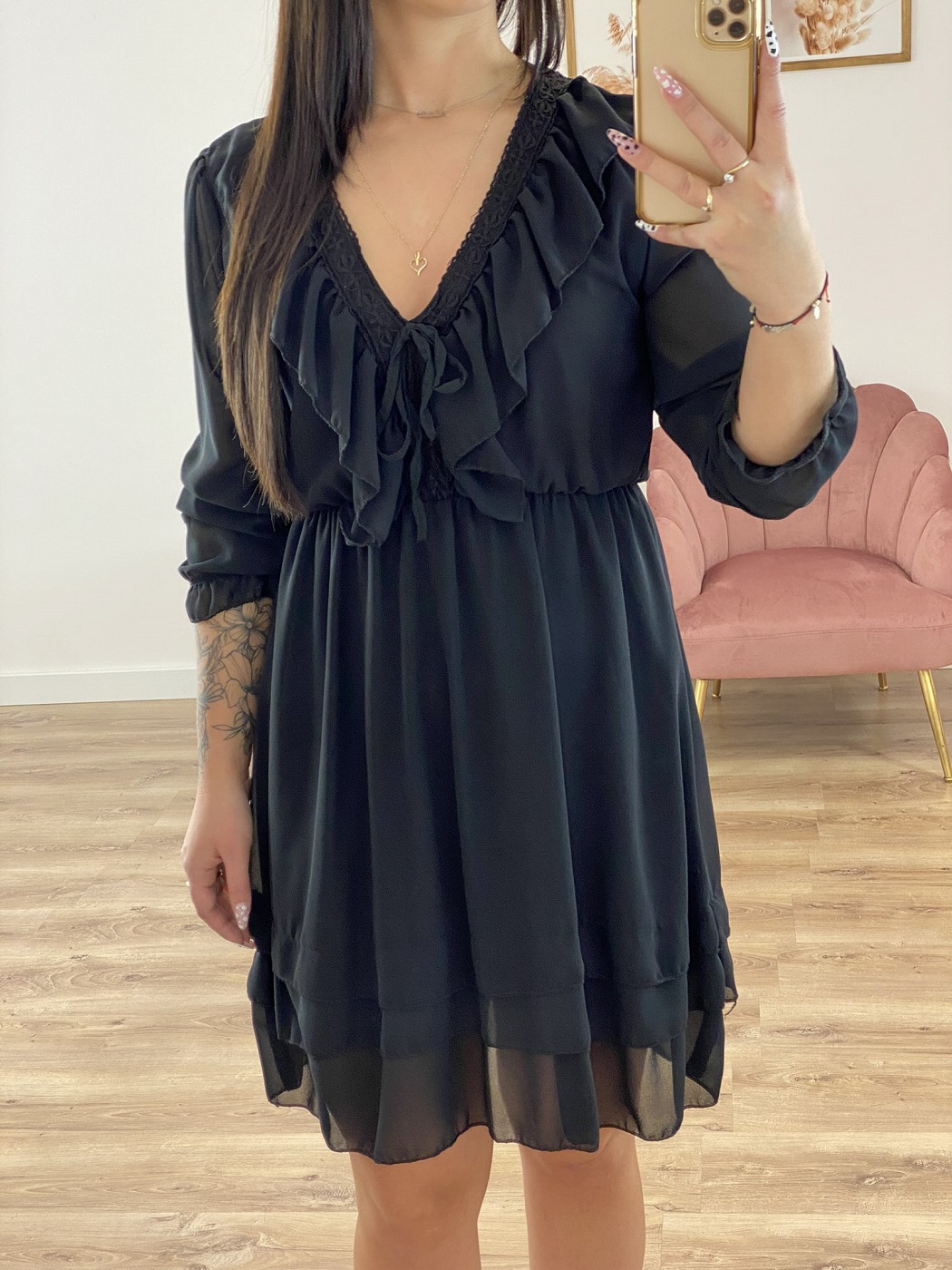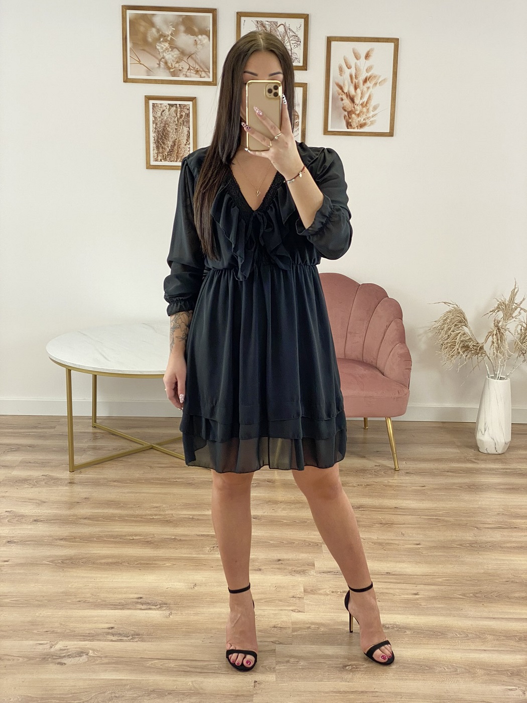 Szyfonowa mini sukienka z falbankami. Posiada dekolt w kształcie litery V wykończony falbanką i koronkową tasiemką, długi rękaw z gumką i gumkę w pasie. Sukienka posiada podszewkę.