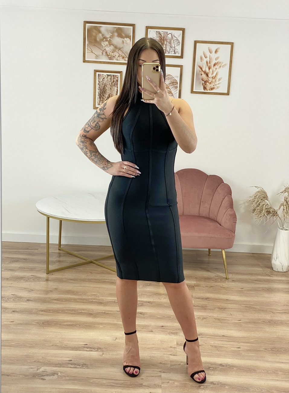 Dopasowana, bandażowa sukienka do kolana, uszyta z prążkowanego, mocno elastycznego materiału. Zapinana z tyłu na zamek.