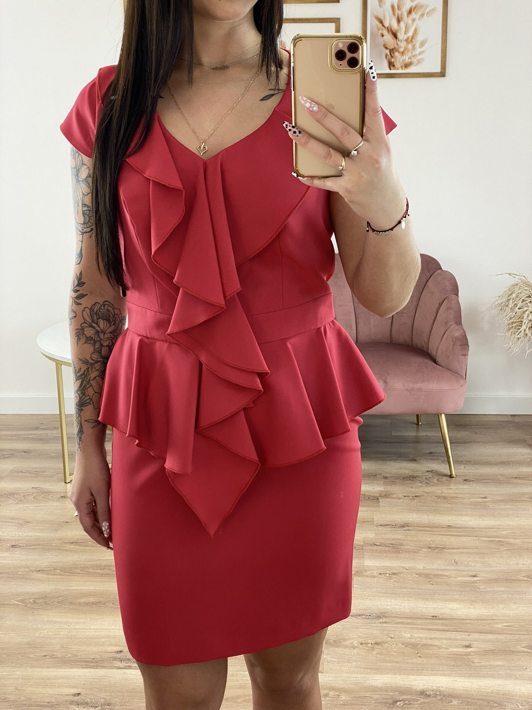 Dopasowana sukienka z efektowną falbaną przy dekolcie i w talii. Sukienka posiada pasek modelujący talię. Góra sukienki posiada podszewkę. Zapinana z tyłu na kryty zamek.