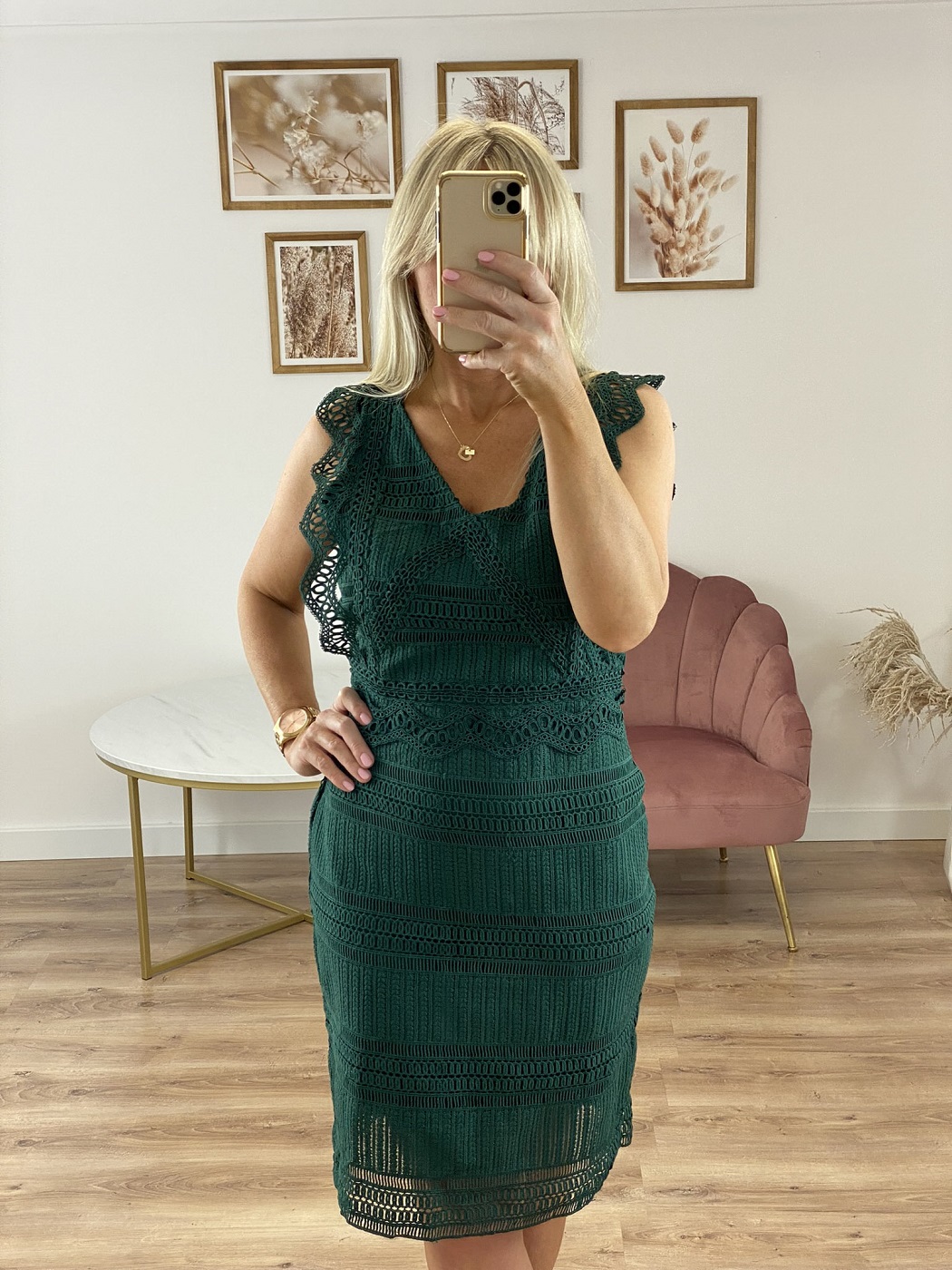 Koronkowa, ołówkowa sukienka bez rękawów. Zapinana z tyłu na zamek. Posiada podszewkę.