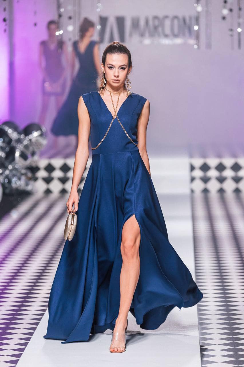 MILENA maxi sukienka, rozszerzana ku dołowi. Uszyta z błyszczącego materiału, posiada dwa rozcięcia z przodu. Dekolt w kształcie litery V.