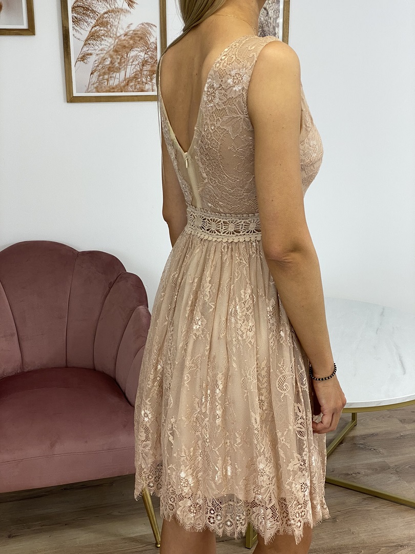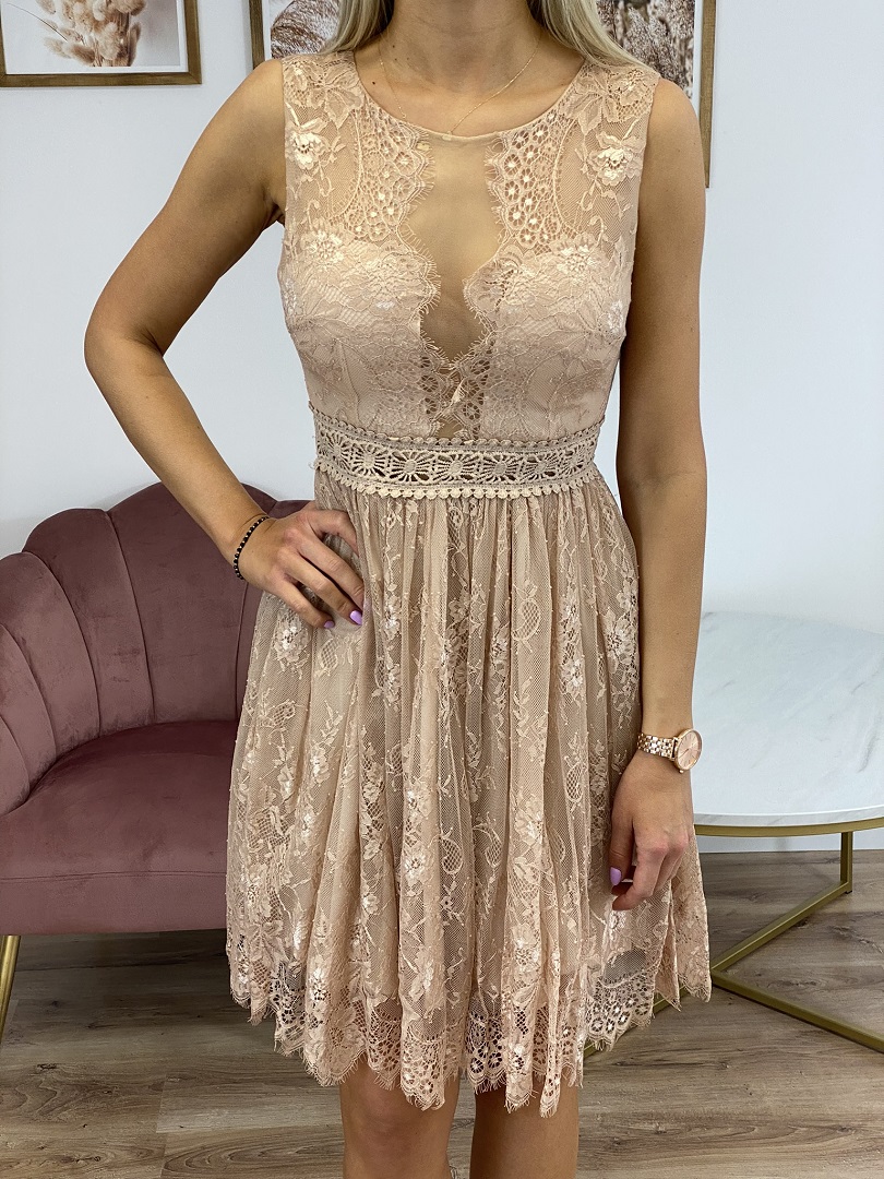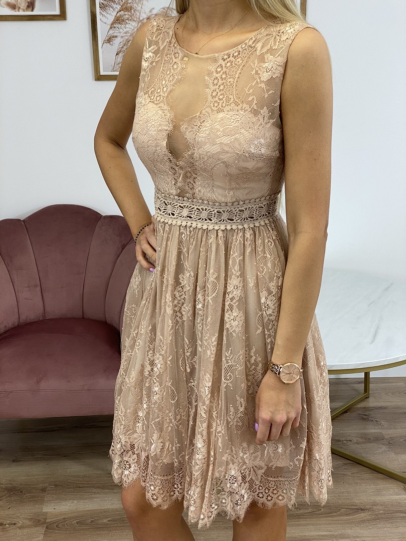 Mini koronkowa sukienka bez rękawów, z rozkloszowanym dołem. W talii posiada ozdobny pasek. Sukienka zapinana z tyłu na kryty zamek. W całości uszyta na podszewce.