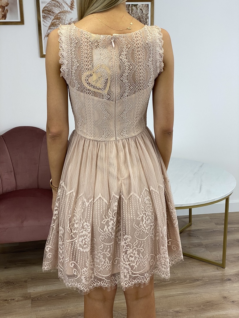 Mini koronkowa sukienka bez rękawów, z rozkloszowanym dołem, posiada wszyte poduszki na biuście. Sukienka zapinana z tyłu na kryty zamek. W całości uszyta na podszewce.