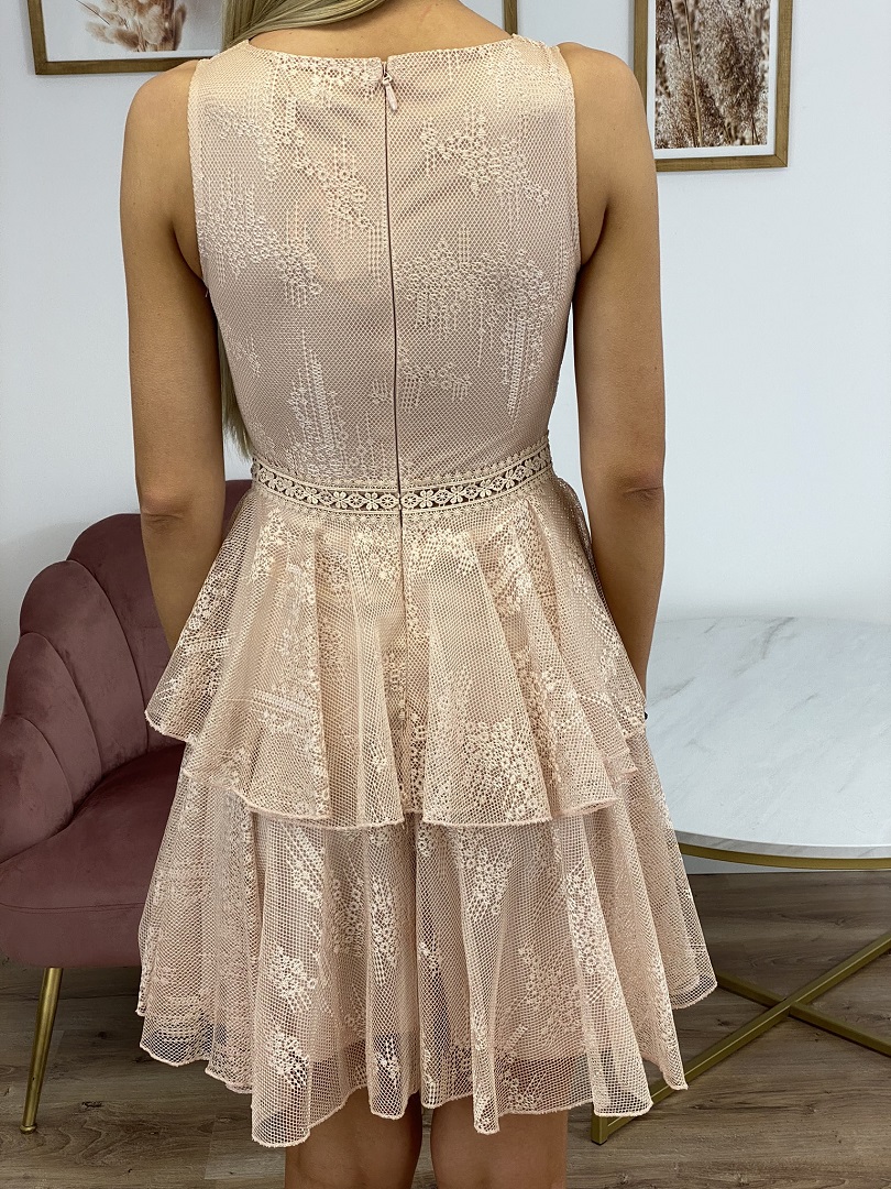Mini koronkowa sukienka bez rękawów, z rozkloszowanym dołem i dwiema falbanami. W talii posiada ozdobny pasek. Sukienka zapinana z tyłu na kryty zamek. W całości uszyta na podszewce.