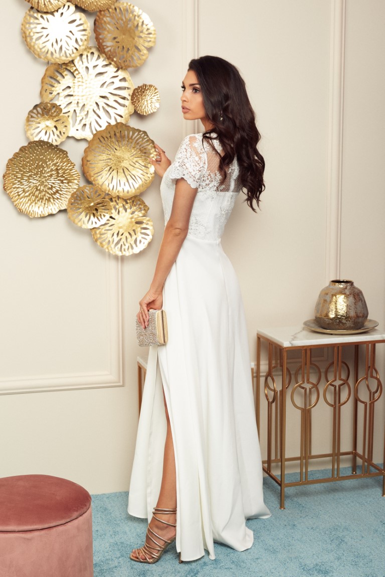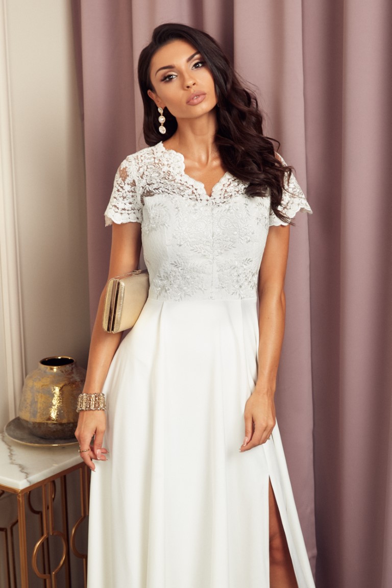 PAULA - piękna długa suknia plus size z koronkową górą, z krótkim rękawkiem. Ładnie wyeksponowany dekolt w serek, wykończony ozdobną koronką. Dół rozkloszowany wykonany z lejącego materiału z rozcięciem odsłaniającym nogę. W pasie zakładki, które wysmuklają talię. Sukienka zapinana z tyłu na zamek. Występuje w wielu kolorach.
