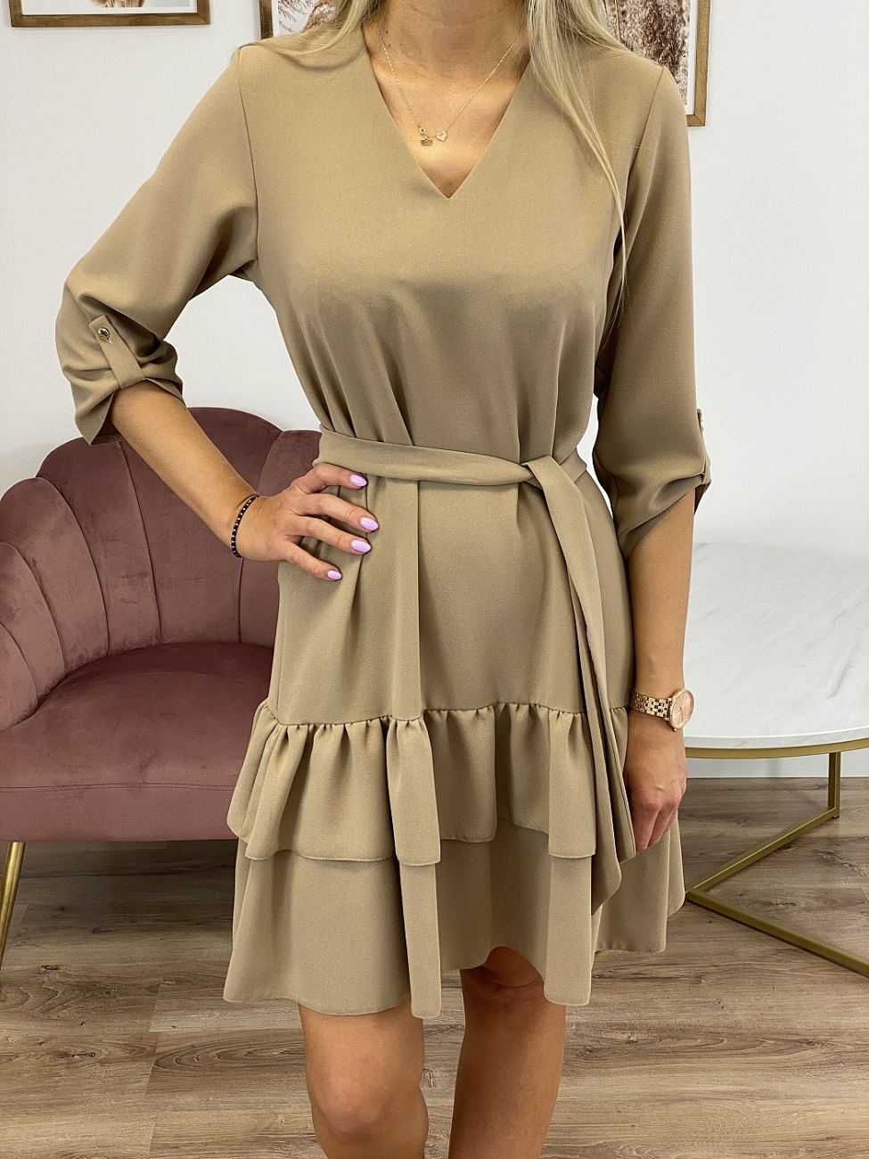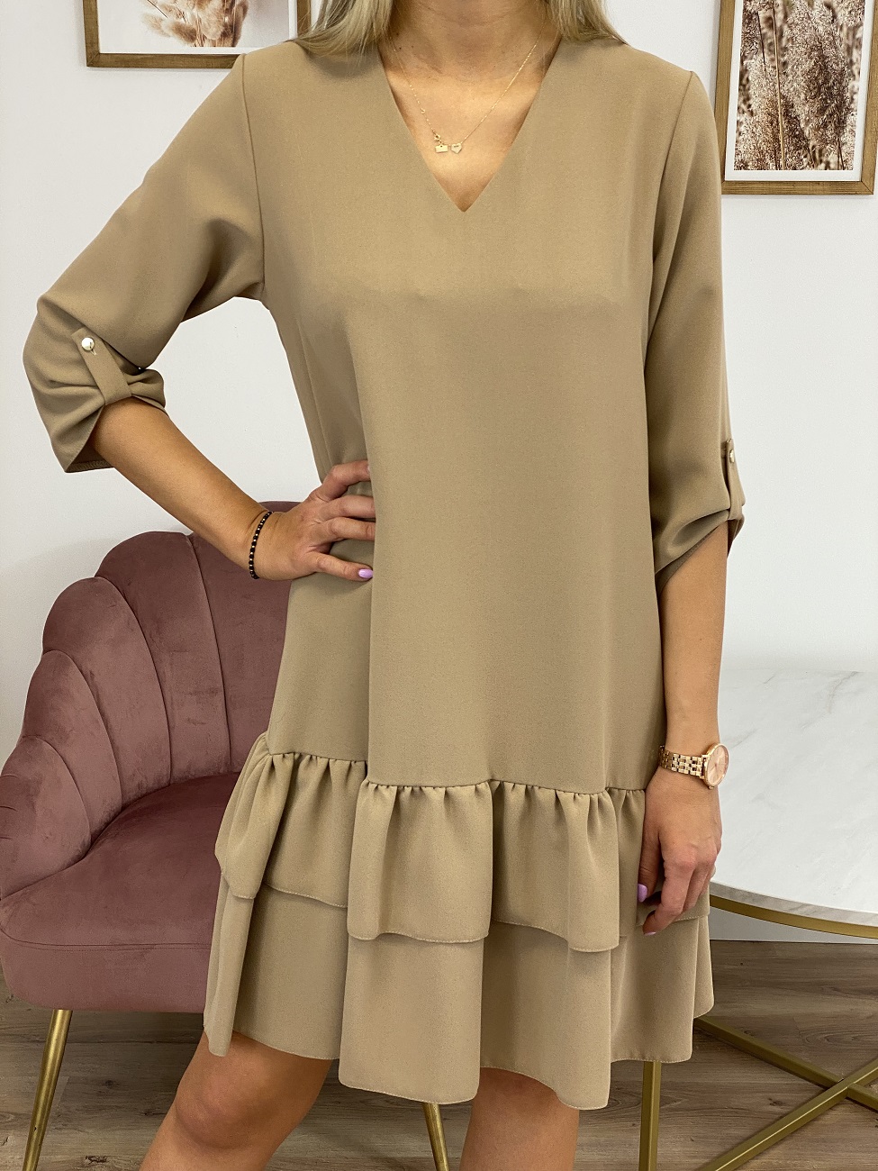 Prosta beżowa sukienka z falbankami u dołu. Posiada rękaw do łokcia zapinany na złoty guzik, dodatkowo posiada pasek. Wkładana przez głowę.