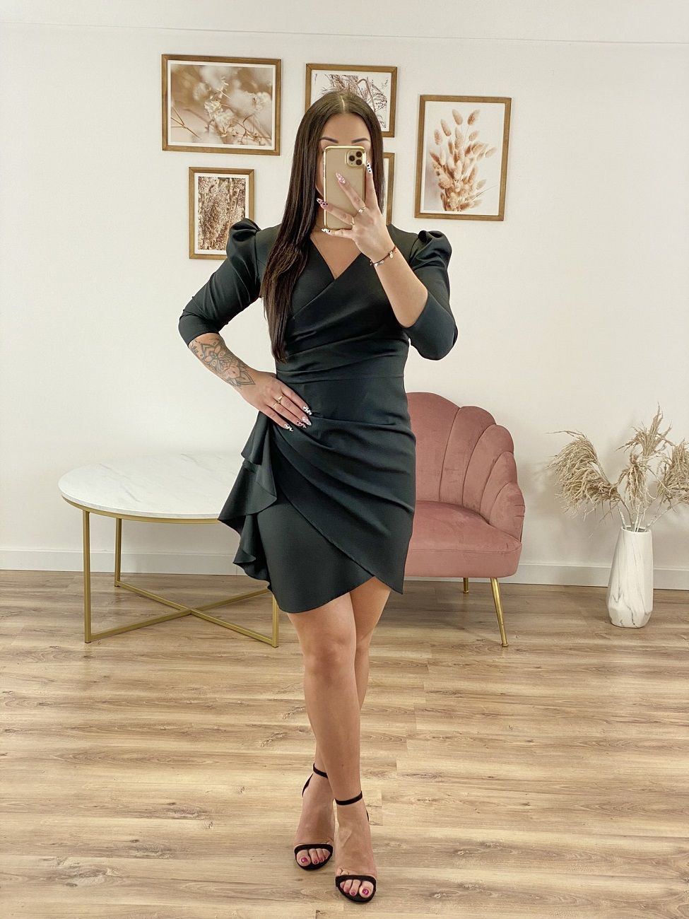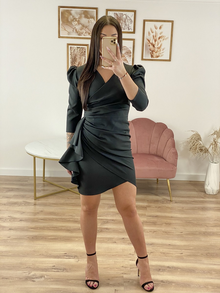 QUEENY - krótka, dopasowana sukienka z rękawem. Posiada kopertowy dekolt, marszczenie oraz falbankę z boku na wysokości talii. Zapinana z tyłu na kryty zamek.