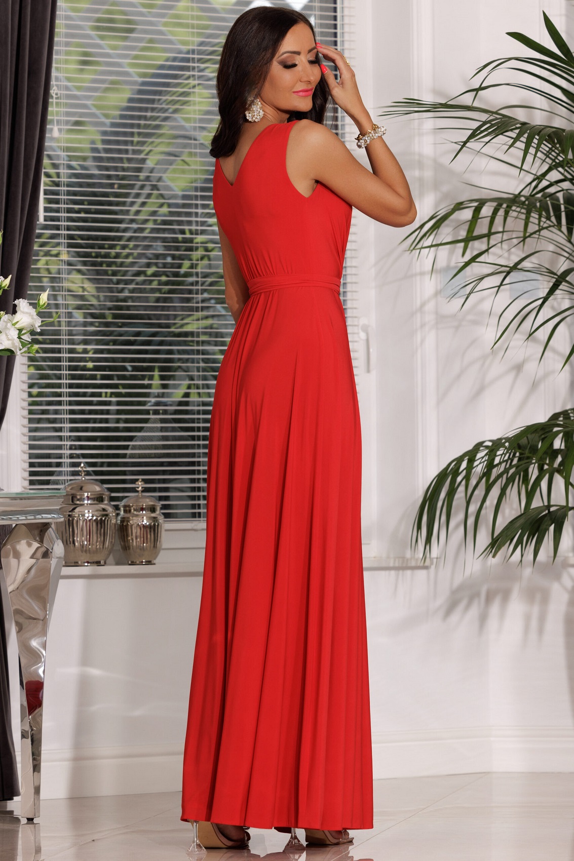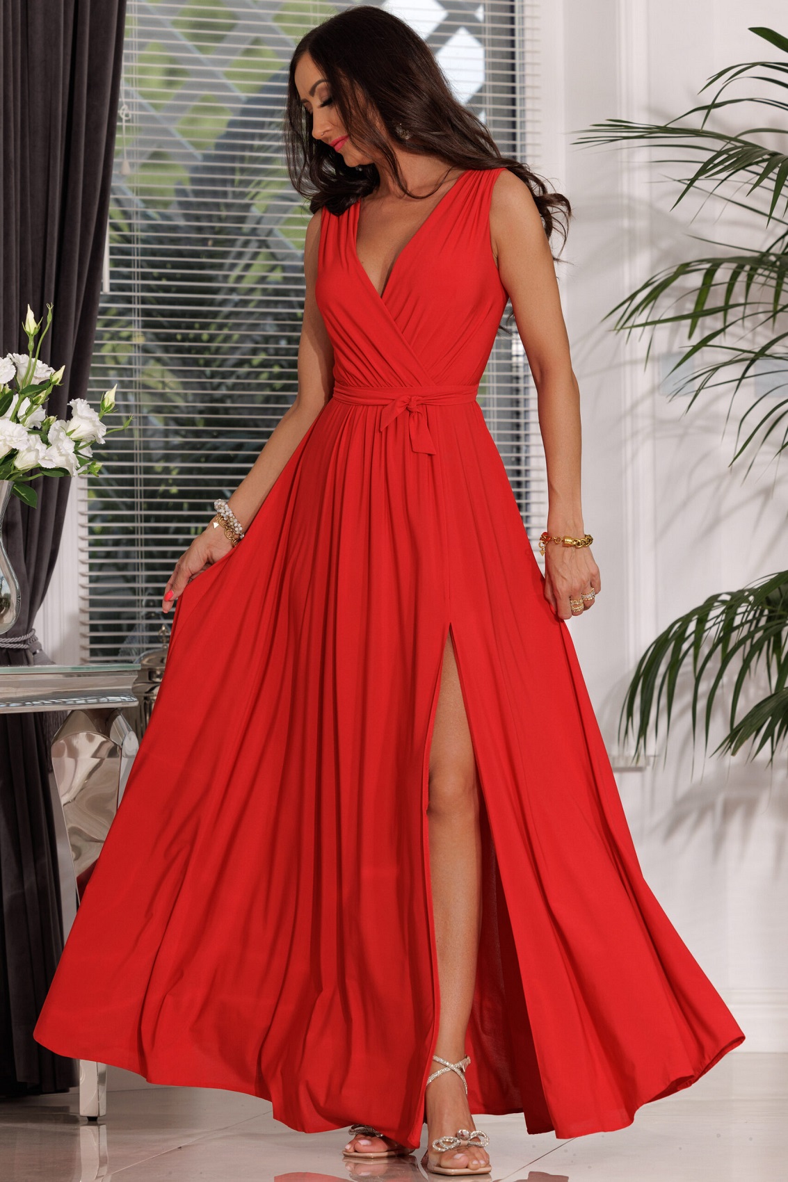 SALMA GŁADKA ROZKLOSZOWANA SUKIENKA MAXI Z KOPERTOWYM DEKOLTEM CZERWONA