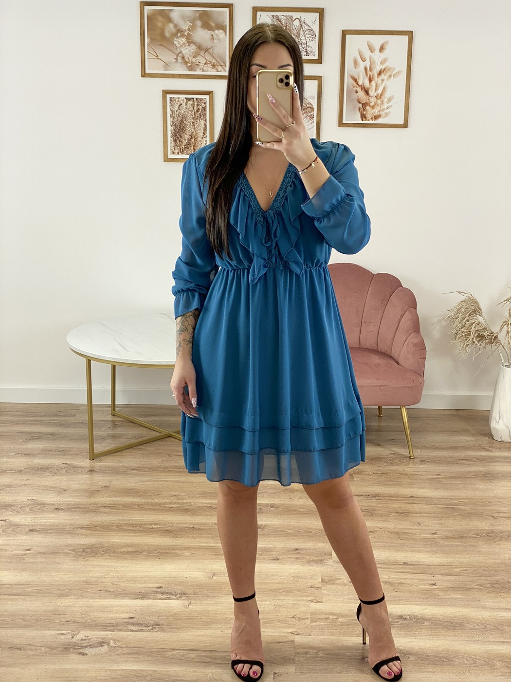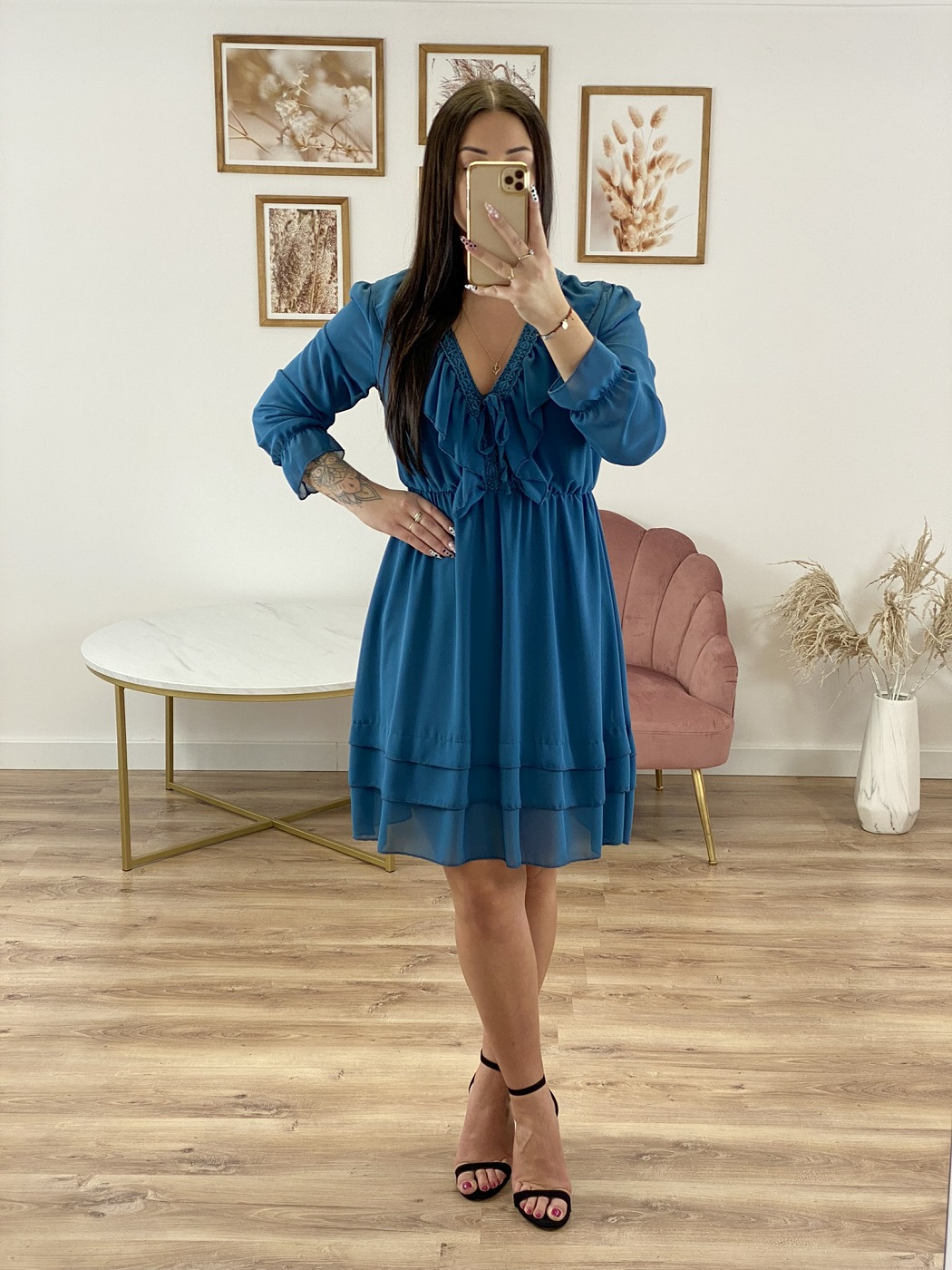 TURKUSOWA SZYFONOWA MINI SUKIENKA Z FALBANKAMI 1D3241